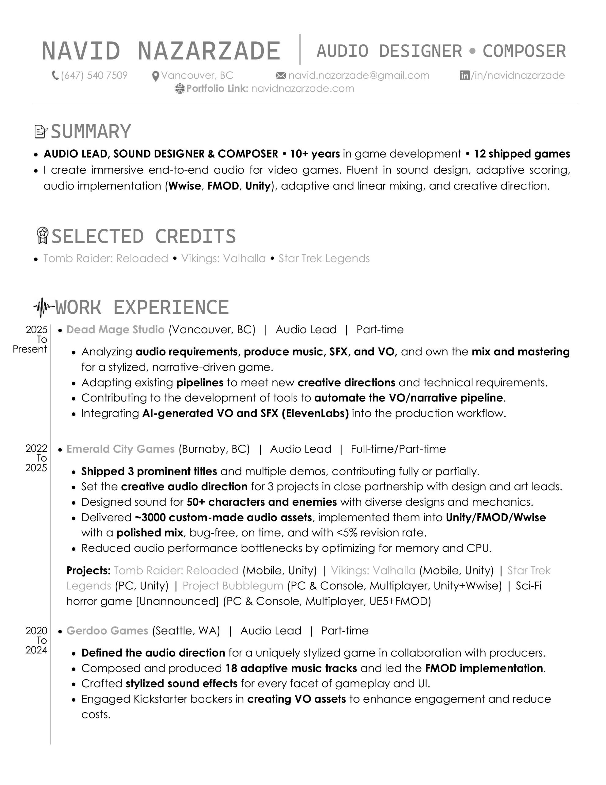 I am an Audio Lead, Sound Designer, and Composer who creates end-to-end immersive audio experiences for video games. From designing engaging sound effects to composing captivating music and integrating them seamlessly into gameplay, I ensure each project delivers a unique and immersive auditory experience.Credits highlight: Tomb Raider: Reloaded, Vikings: Valhalla, Star Trek Legends.